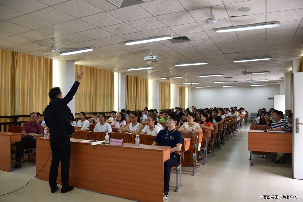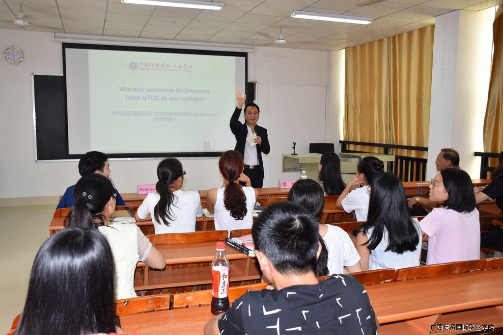 7月27日上午广西彩神国际职业学院邀请泰国商会大学国际学院院长Dr.Srimoon举办讲座🕘,给即将于今年9月份赴泰学习学生提供出国留学前的指导,与前来参加讲座的师生面对面交流。