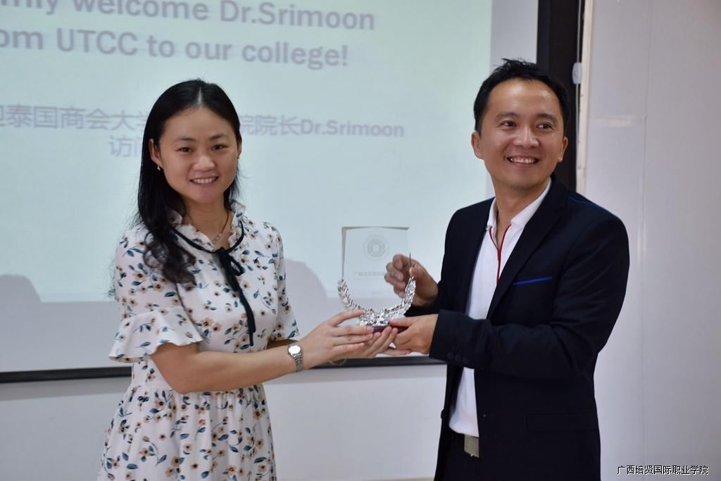 学院国际部梁慈老师代表学院给Dr.Srimoon赠送纪念品