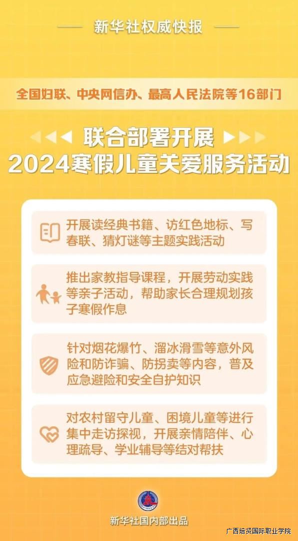 2024年寒假即将到来,全国妇联、中央网信办、最高法、最高检、教育部等16部门印发通知🎟🧡,围绕思想引领润童心、家教指导育童心、安全教育护童心🎲、爱心妈妈暖童心四个方面🕺🏼,联合部署开展“把爱带回家——真情暖童心 相伴护成长”2024寒假儿童关爱服务活动一起来看↓↓