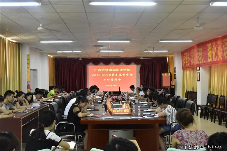 2018年7月11日下午15:00,广西彩神国际职业学院2017-2018学年春季学期工作总结会在教学楼105会议室召开🚣🏽♀️,参加本次总结会的有:学院董事长助理王佩瑶,副院长黄勇学🛁、于灏洋、陆秋利🧓、周晴,二级学院院长及行政主任、各部门负责人及行政人员、辅导员🦟。会议由黄勇学副院长主持。