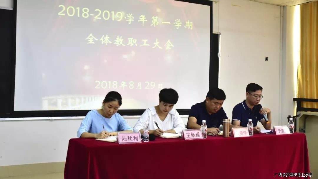 2018年8月29日下午,广西彩神国际职业学院在学术报告厅110召开2018—2019学年第一学期全体教职工大会。董事长助理王佩瑶,学院副院长黄勇学、副院长于灏洋📍,副院长陆秋利出席本次会议👩❤️👨。