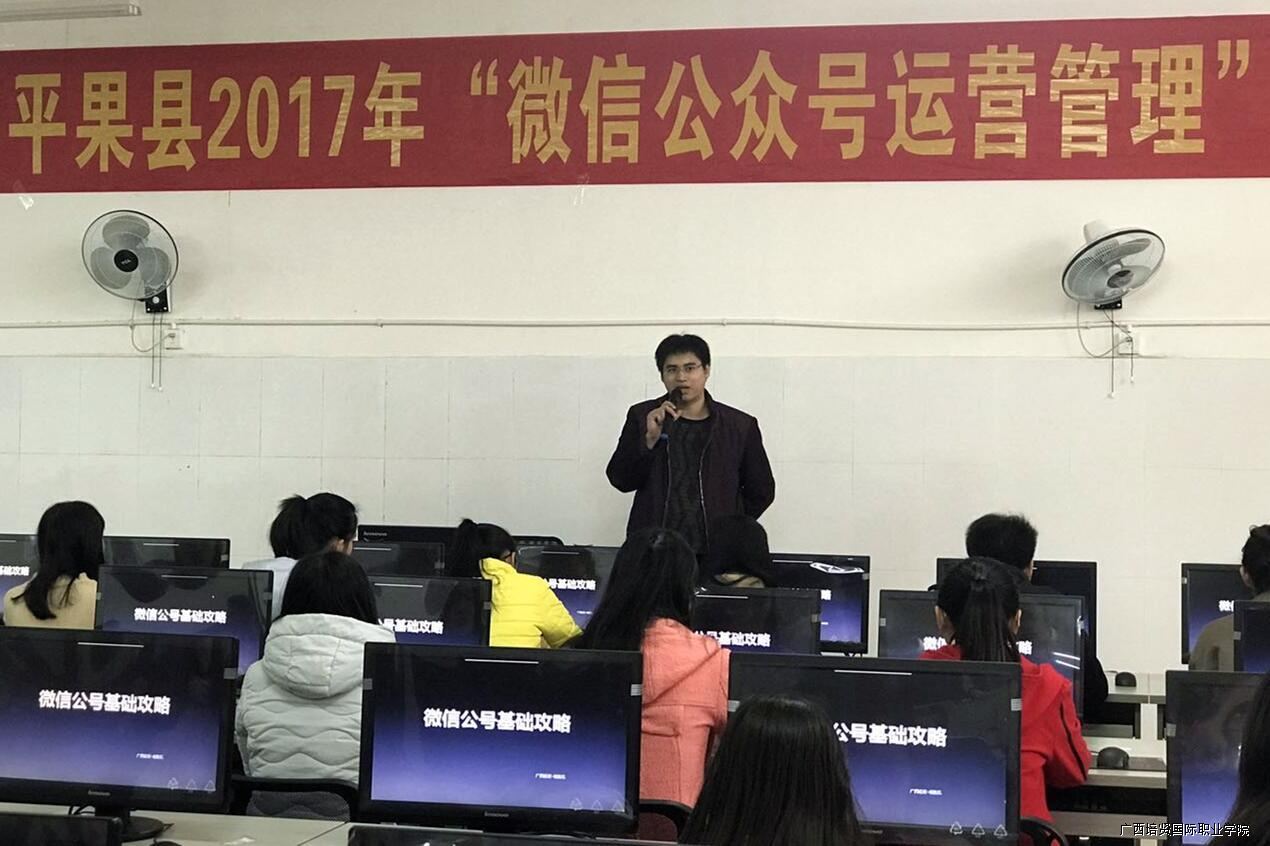为使平果县广大青年尽快掌握该平台的使用方法,提高宣传工作者对微信公众号的运营能力,从而更好的开展宣传工作,2月25日上午👙,由共青团平果县委员会、平果县网商协会、平果县电子商务公共服务中心组织的“‘红城青年讲堂’微信公众号培训班”在我校“互联网+”人才培养实战基地隆重举办,平果县广大青年以及我校部分感兴趣的同学参加培训。