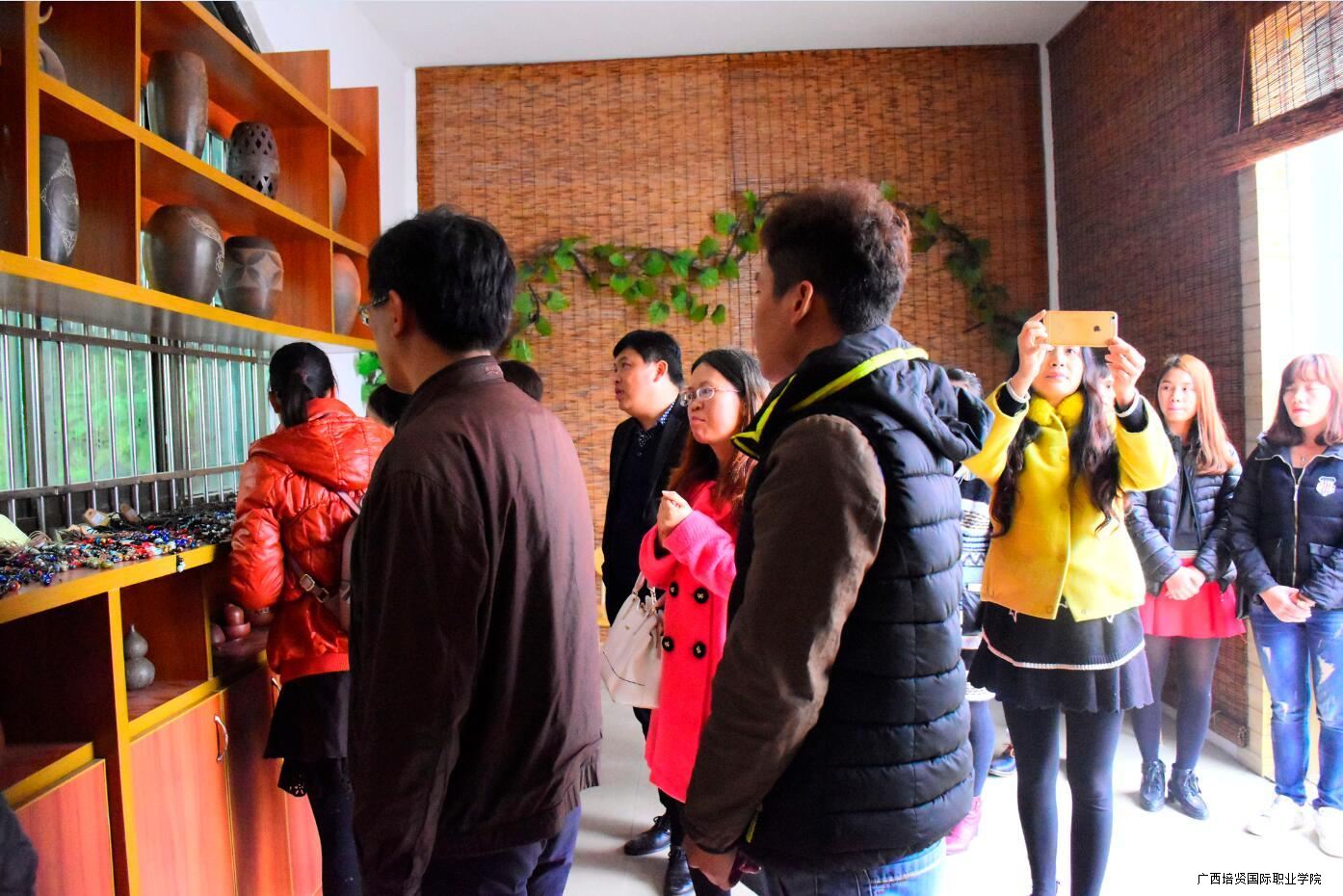 考察团成员参观广西英华国际职业学院学生陶艺作品