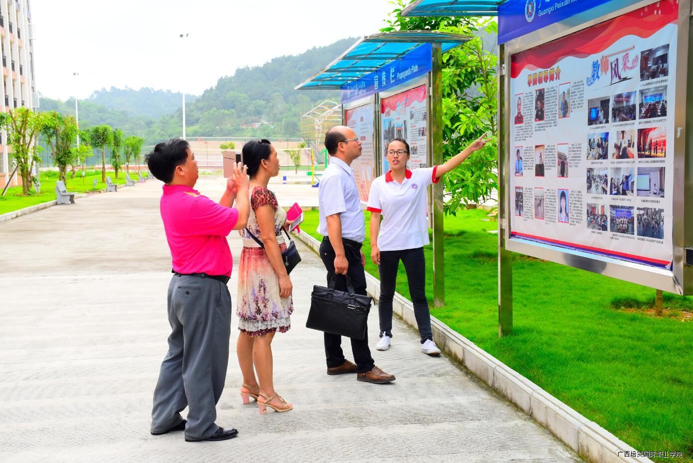 图为张黄中学教师代表团参观我院宣传栏,了解学院相关信息。