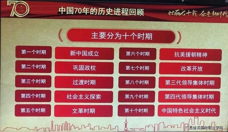 谭书记以建国70周年庆为契机,带领学生们一起回顾新中国成立70周年的历史进程,分为十个时期进行讲述,进而逐步引出中国共产党的发展历史。