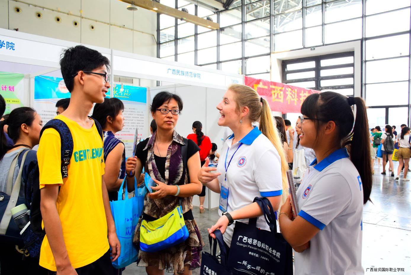 图为我院参加高考咨询会现场👨🏻🍼,外教Mary与考生亲切交谈🐬。