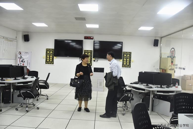 图为林宁校长在李维院长和覃武云书记陪同下在企业认知和会计文化展厅多功能特色实训室参观交流