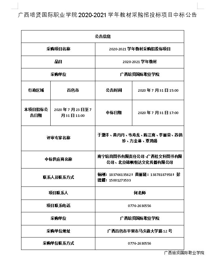 广西彩神国际职业学院2020-2021学年教材采购招投标项目中标公告