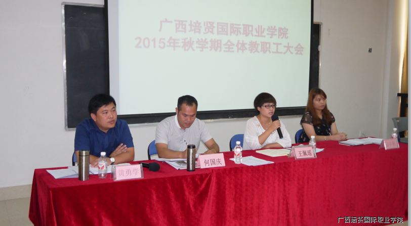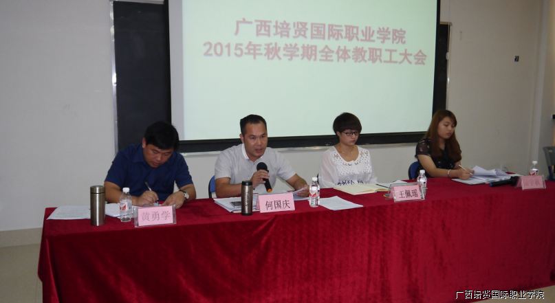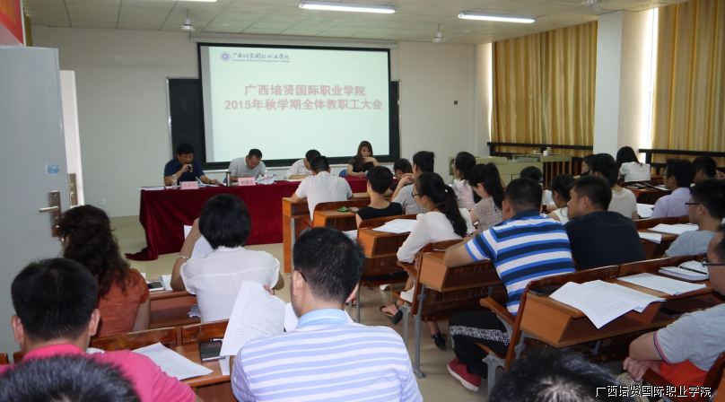 2015年8月28日上午🧑🏻🦯➡️🖥,广西彩神国际职业学院召开新学期全体教职工大会,总结2015上半年工作并对下半年的工作做出部署👨🏻🦽。学院董事会王佩瑶助理、何国庆助理院长出席会议。