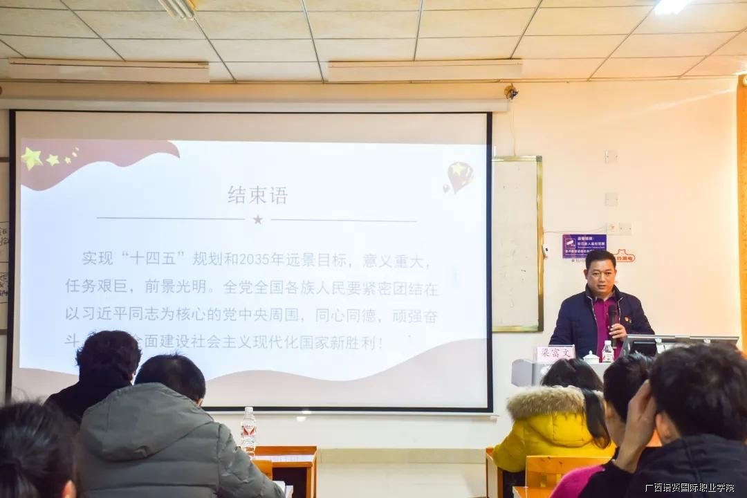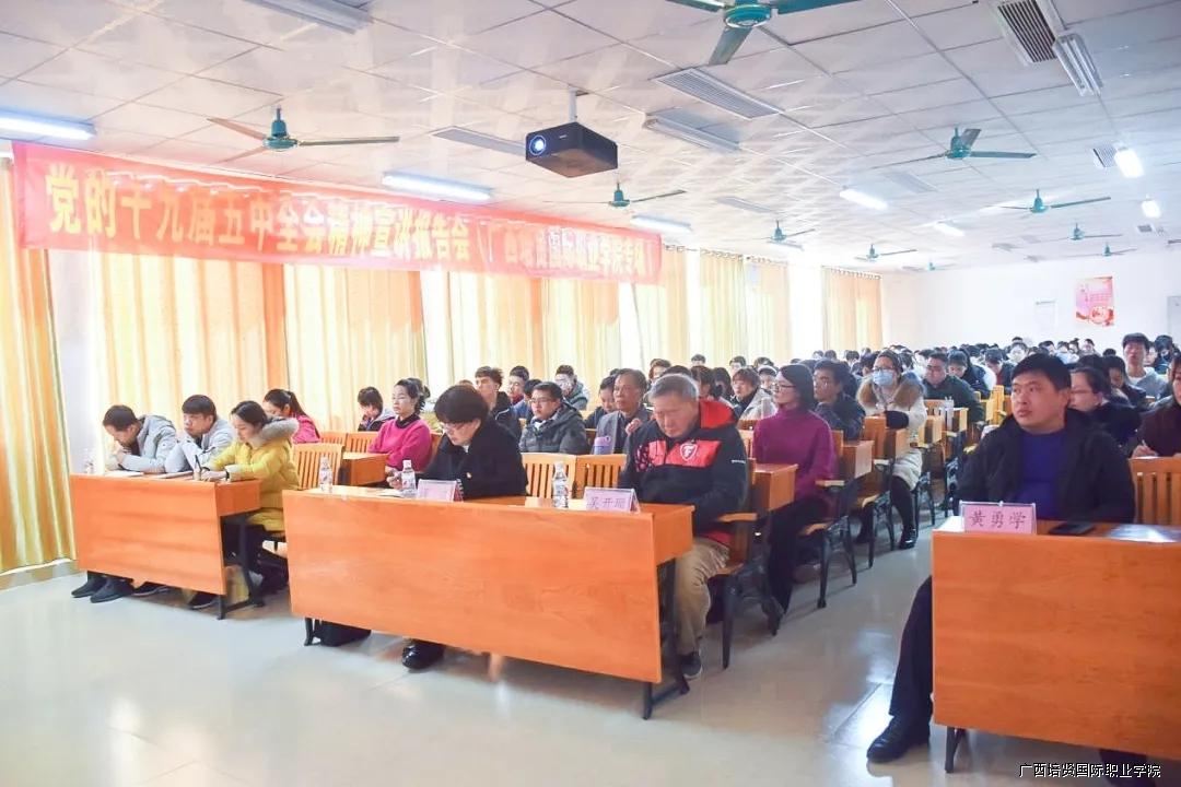12月21日下午,百色市委教育工委委员,市教育局党组成员、副局长梁富文莅临我校开展党的十九届五中全会精神宣讲报告会,我校党委领导班子😕、中层干部、师生代表近200人现场聆听此次宣讲报告会。