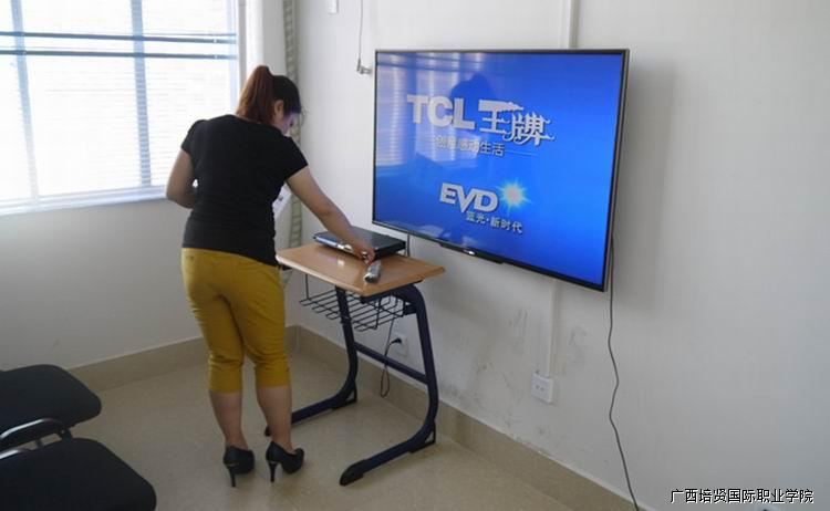 图为何老师检查大教室多媒体设备