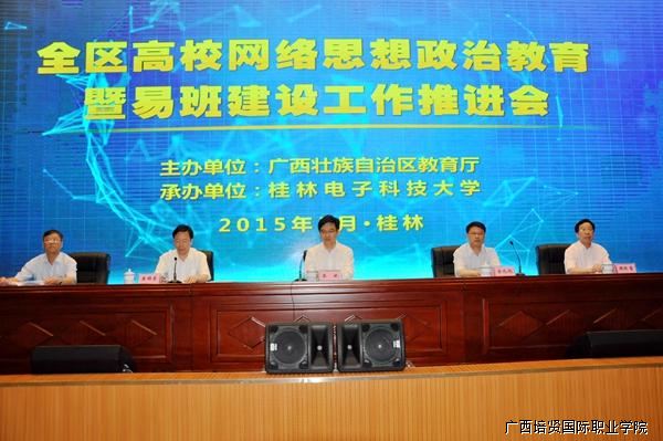 2015年5月15日上午,自治区高校工委🚴、教育厅思政、宣传部门及全区75所高校的分管大学生思想政治工作校领导↪️、学工部门负责人160多名代表齐聚一堂♖,参加由自治区高校工委、教育厅和自治区网信办联合召开的全区高校网络思想政治教育暨易班建设工作推进会。自治区高校工委书记🤰🏼、教育厅厅长秦斌🔑👨🏼🔬,自治区网信办主任金化伦☎,自治区高校工委副书记莫锦荣以及桂电党委书记周怀营、校长古天龙出席会议。大会由自治区高校工委副书记莫锦荣主持。