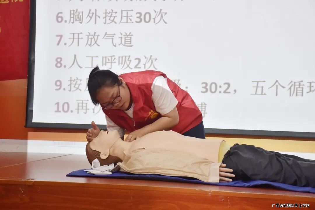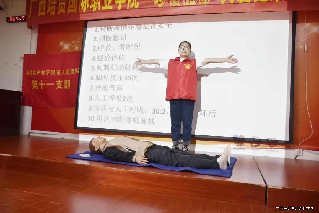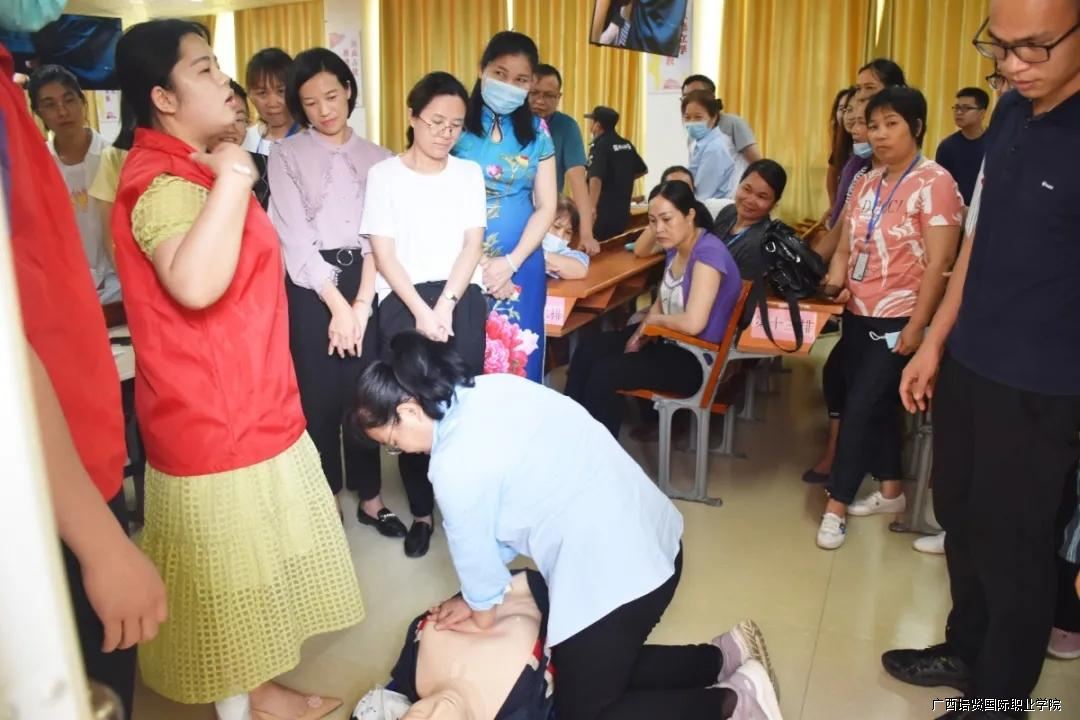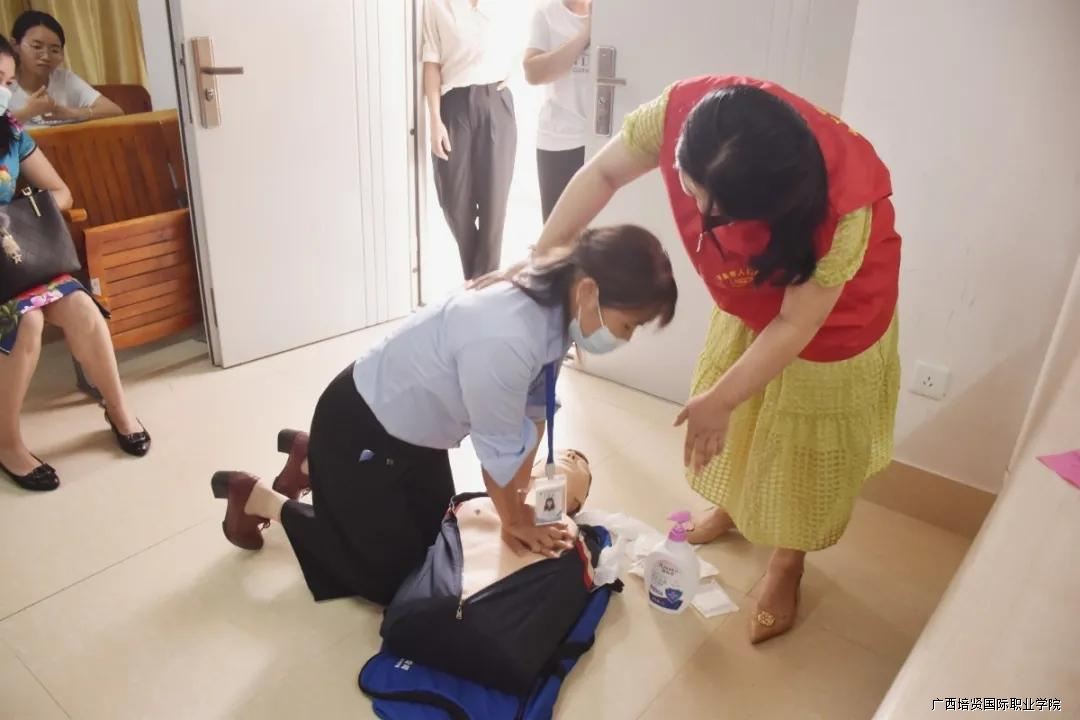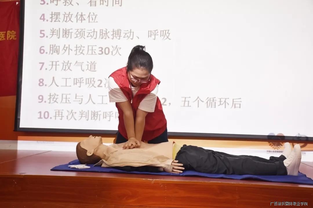 在廖部长耐心的讲解后,我校教职工对于心肺复苏有了一定的了解,在平果人民医院志愿者的专业指导下,我校领导和老师亲自尝试急救操作。