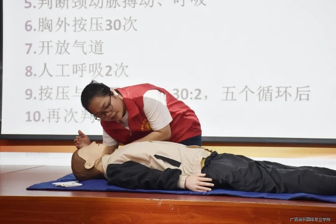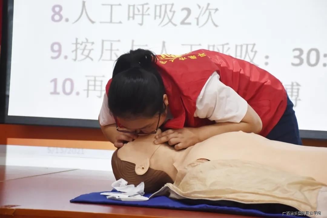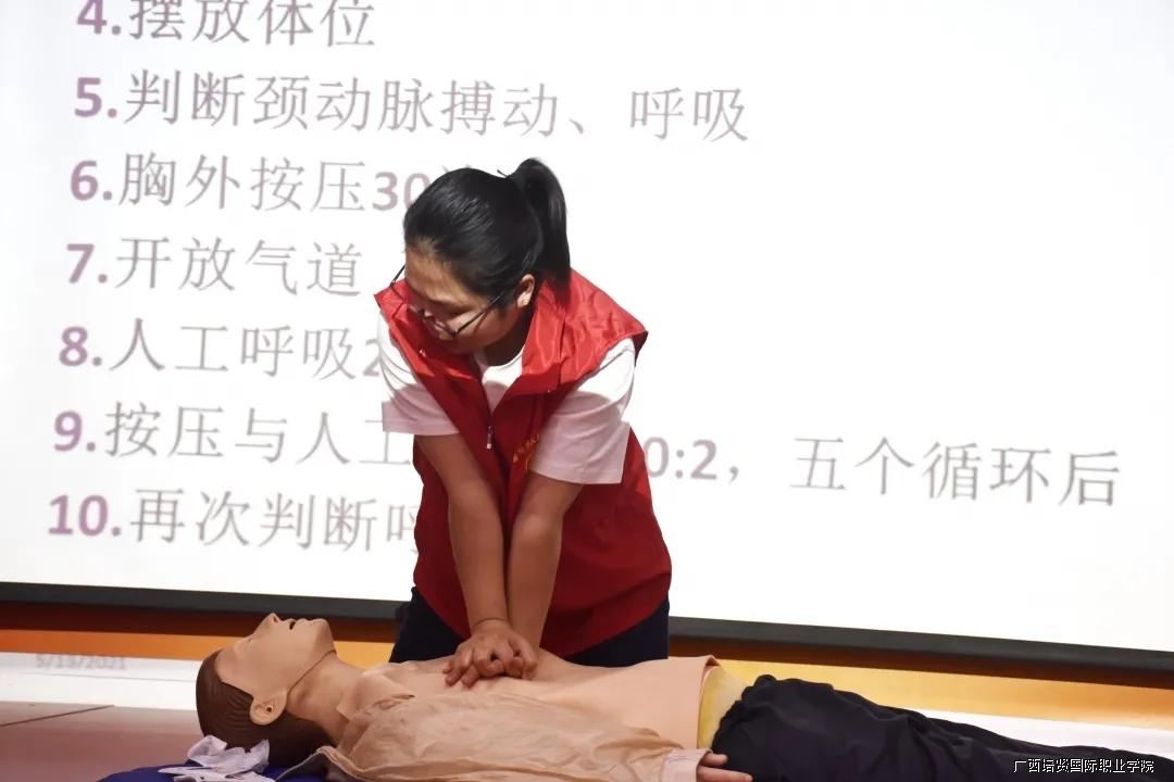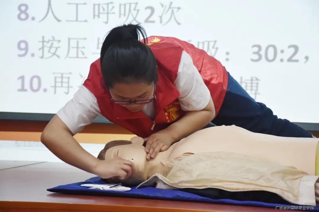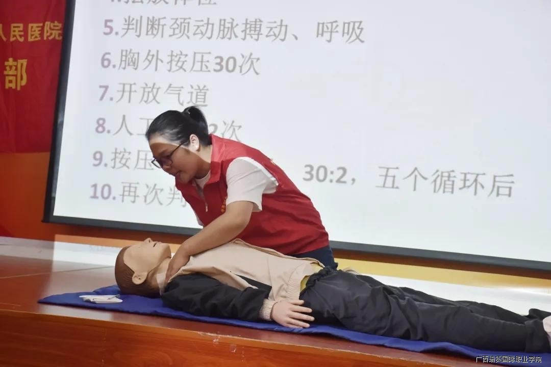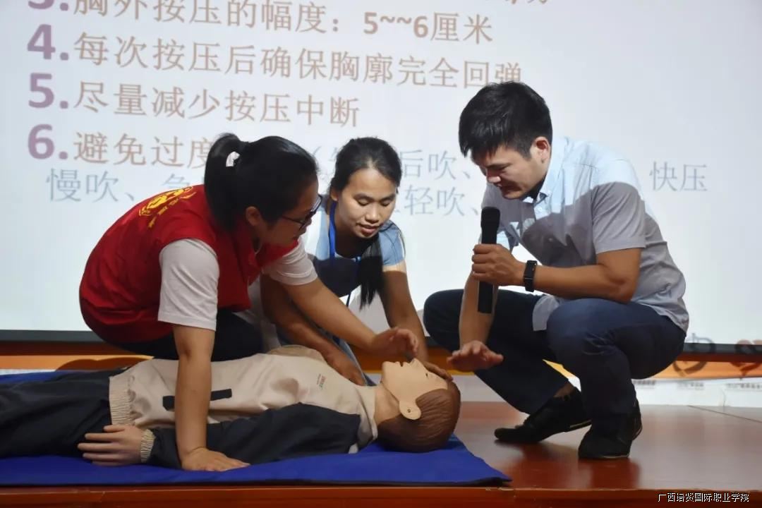 在廖部长耐心的讲解后,我校教职工对于心肺复苏有了一定的了解,在平果人民医院志愿者的专业指导下,我校领导和老师亲自尝试急救操作。