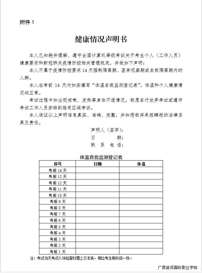 三、考生范围及要求为做好新冠肺炎疫情防控工作👨🏽💼,本次考试,根据教育部考试中心的要求🧖🏽♂️,所有考生在考试时均须提交记录有考前14天体温的《健康情况声明书》(见附件1),考生自行打印🚛,如实填写。