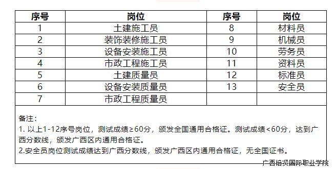 (二)关于证书🙅🏻♂️。土建施工员、装饰装修施工员🩹、设备安装施工员🖐、市政工程施工员、土建质量员、装饰装修质量员👼、设备安装质量员、市政工程质量员、材料员📆、机械员、劳务员、资料员、标准员等13个岗位,测试成绩达60分以上者,颁发全国通用合格证🤳;60分以下🩴,达到广西分数线者🤸♂️,颁发广西区内通用的合格证。安全员岗位达到广西分数线者,颁发广西区内通用的合格证,无全国证🧘🏻♂️。