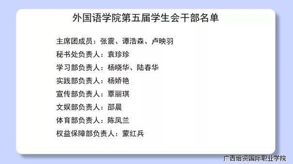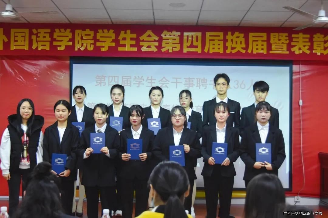 2021年11月18日晚上7点🛜,广西彩神国际职业学院外国语学院第四届学生会换届暨表彰大会于1教110学术报告厅顺利召开。参加本次大会的领导嘉宾有:外国语学院副院长潘霜梅老师🙍🏼♀️、外国语学院院长助理覃婷老师、外国语学院党支部书记韦牡丹老师、外国语学院学生科科长农业涛老师、校团委干事李越老师🔆、互联网营销学院分团委负责人向子馨老师、财经管理学院分团委负责人谢兴斌老师♢、艺术工程学院分团委负责人陈燕娟老师🧘🏻、外国语学院分团委负责人黎晴晴老师、外国语学院党政办干事钟榕🫰🏽🧘🏼♀️、陈卡文老师,外国语学院辅导员代表,以及各校级学生组织代表。