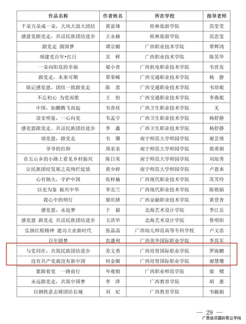 近日,广西壮族自治区教育厅下发《自治区教育厅关于公布“感党恩 跟党走 共话民族团结进步”征文活动评选结果的通知》(桂教民教〔2021〕12号)🧑🦲,我校苏文勇同学、何金媚同学的作品荣获大学组三等奖,罗海鹏老师、谢慧珊老师荣获指导奖🏌🏻♂️。