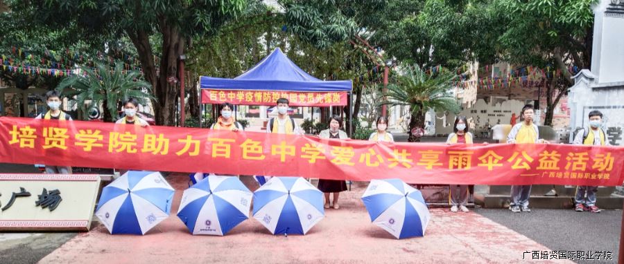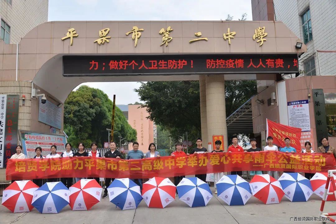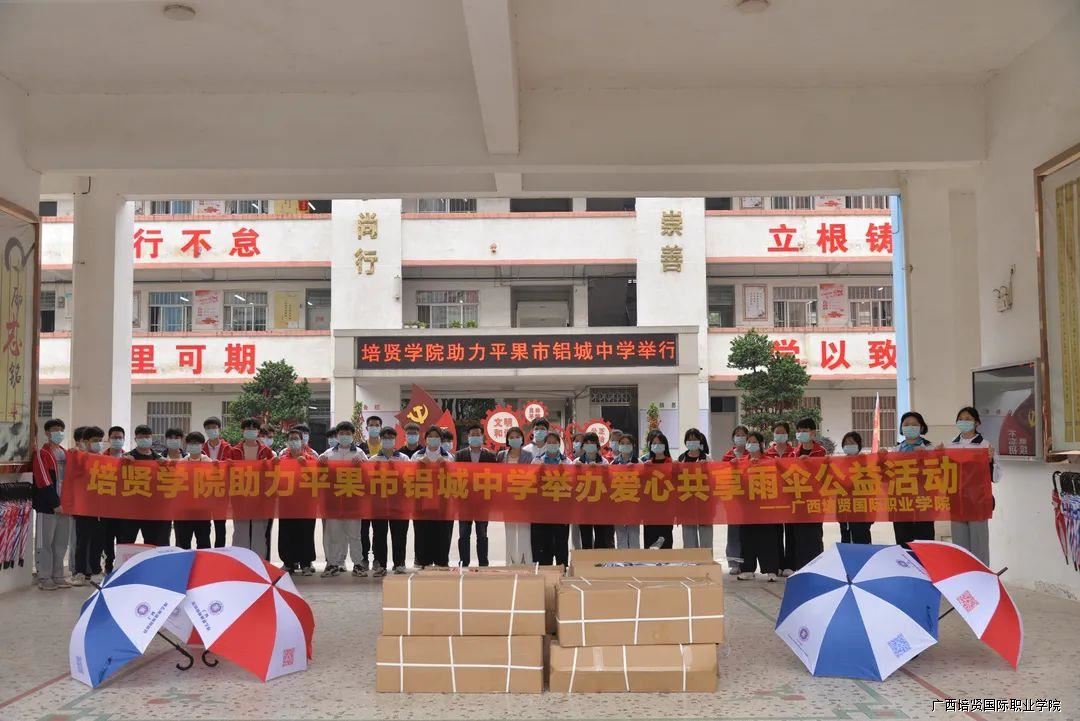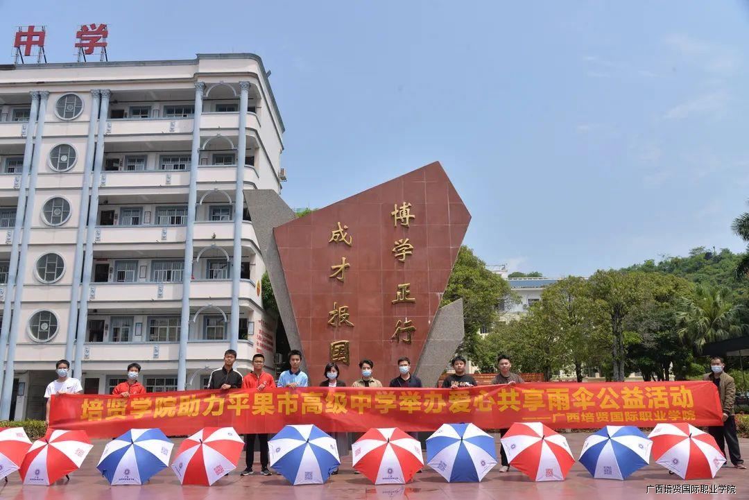 4月20日,我校助理校长陈艳秋🔣,招生办黄金梅老师🥹、宁永尧老师、黄成老师代表学校向平果市铝城中学助力1000把爱心雨伞、平果市第二中学助力800把爱心雨伞✪、平果市高级中学助力500把爱心雨伞;学校招生办陆艳灵老师代表学校向百色中学助力500把爱心雨伞、百色三中助力500把爱心雨伞👕。
