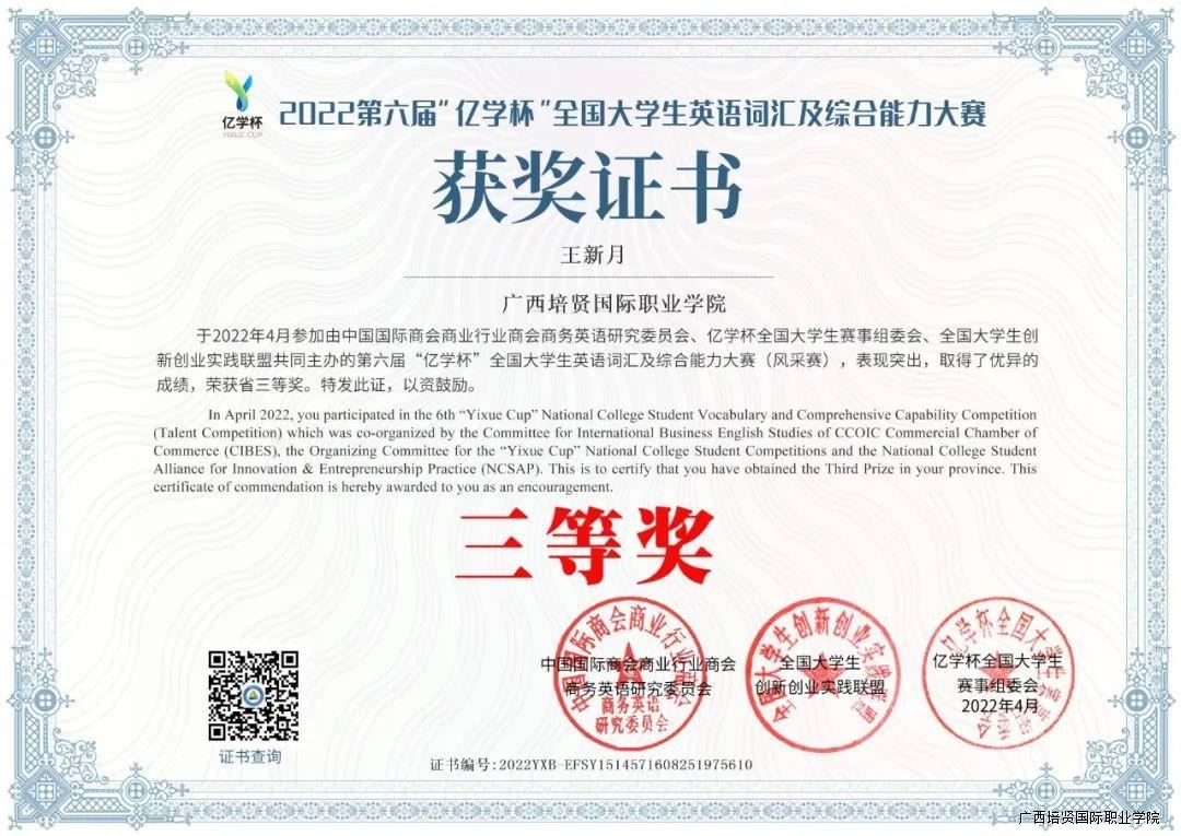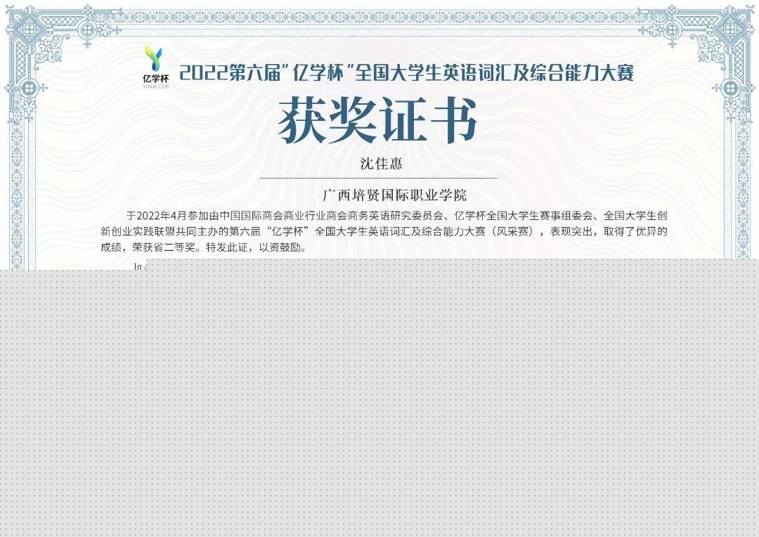 能够在这次比赛中获奖我感到非常开心⏰。参与各类竞赛不仅能有益于自身专业知识水平的提升,从中锻炼自己的英语能力,得到的获奖证书还可以为自己的简历添砖加瓦。我希望彩神的每一位学生都能积极地去参加各类比赛活动,并拿证书呀!