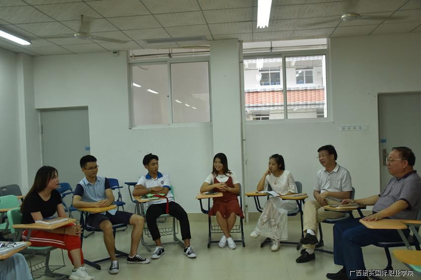 广西工程职业学院党委书记黄友(右二)👨🏿🦳,北海艺术设计学院党委书记贺争平(右一)与我院学生进行座谈