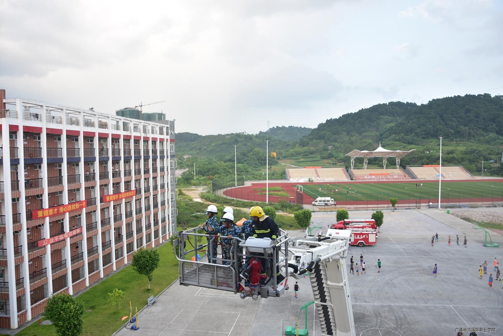 为普及2017级学生消防知识,进一步提高广大师生员工的消防安全意识和自防自救能力👨🏿🏭,了解消防器材的使用方法,熟悉火灾发生后灭火程序🙇♀️,学院特别邀请武警百色消防支队平果中队到校🧑🏼🏭,于校园田径场开展消防灭火演练。