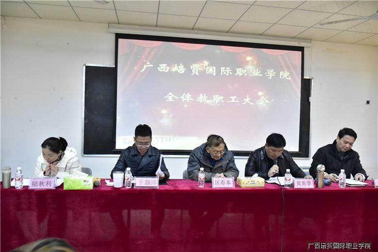 2018年2月6日下午🙍🏽,广西彩神国际职业学院召开全体教职工大会。学院副董事长区寿本博士📪🧟、学院副院长黄勇学、副院长于灏洋、副院长陆秋利、副院长周晴出席了大会。