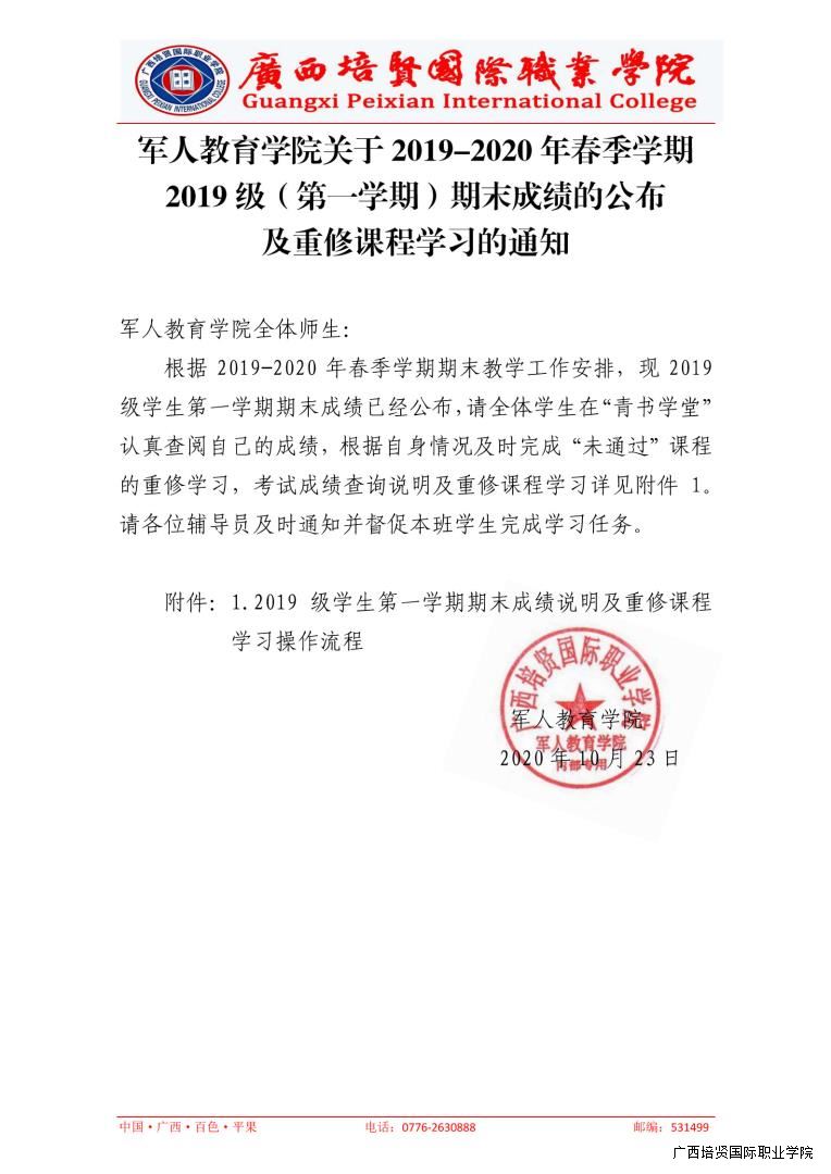 1. 军人教育学院关于2019-2020年春季学期2019级(第一学期)期末成绩的公布及重修课程学习的通知