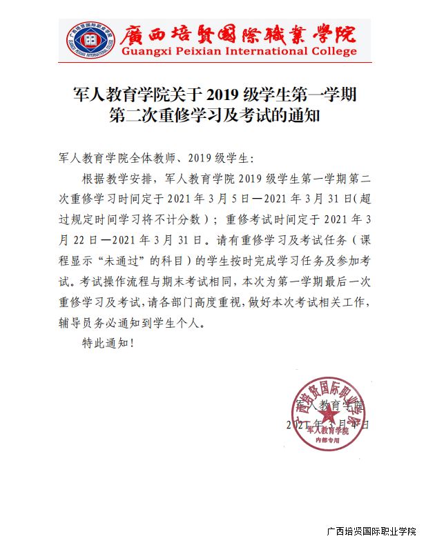 军人教育学院关于2019级学生第一学期第二次重修学习及考试的通知