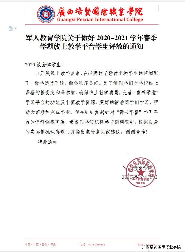 军人教育学院关于做好2020-2021学年春季学期线上教学平台学生评教的通知(学生版)