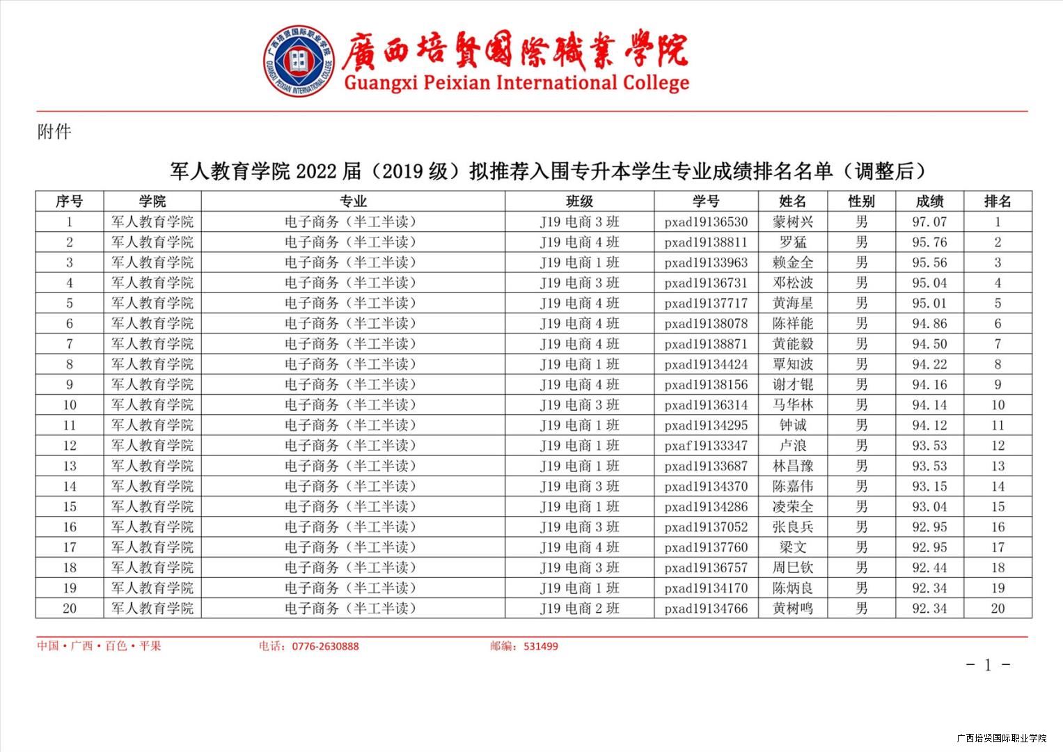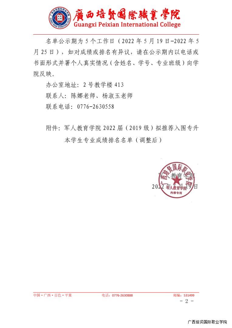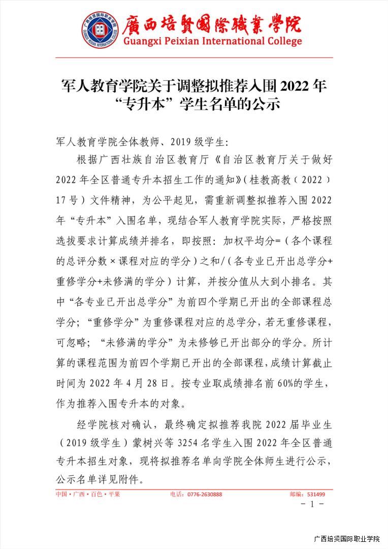 军人教育学院关于调整拟推荐入围 2022 年 “专升本”学生名单的公示