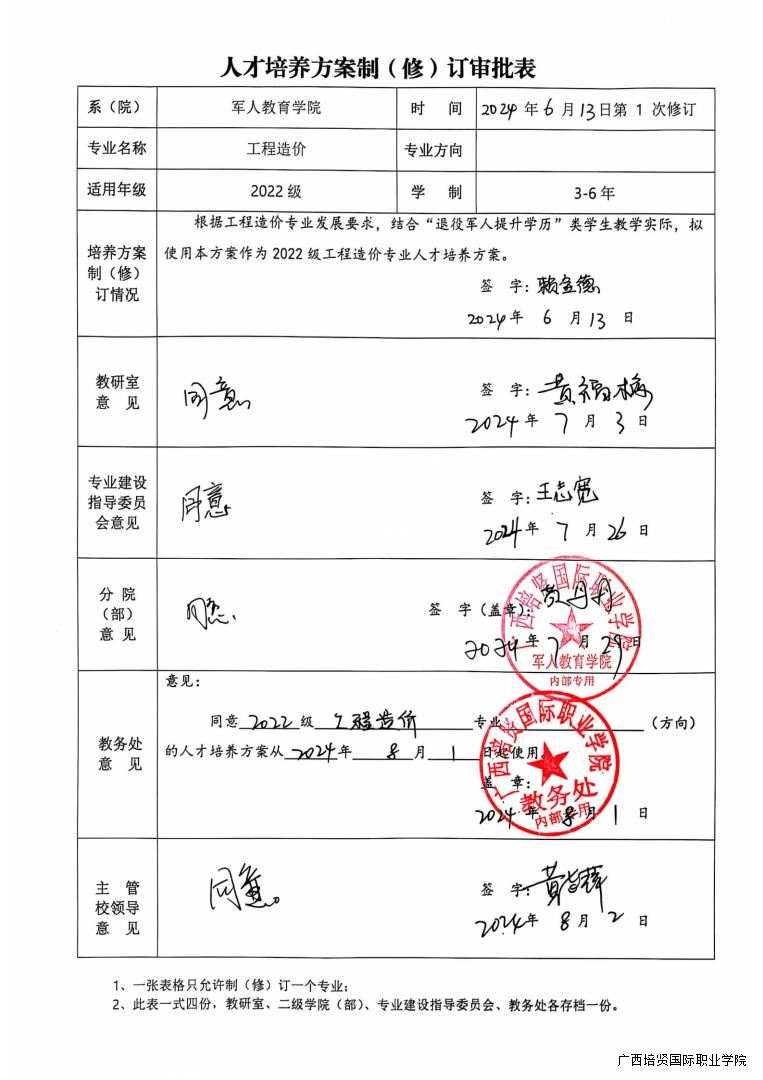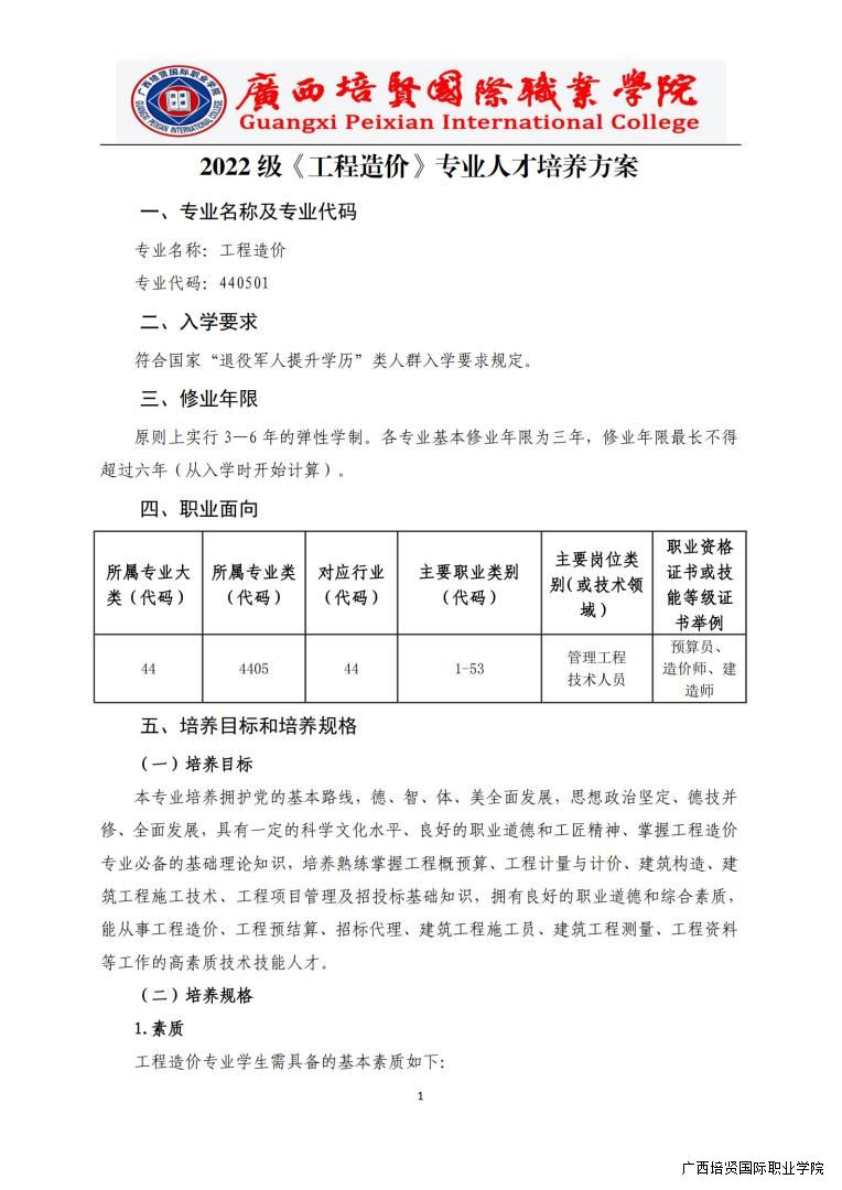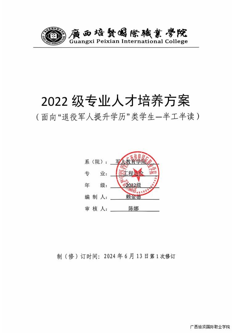 广西彩神国际职业学院军人教育学院2022级工程造价专业人才培养方案(半工半读)