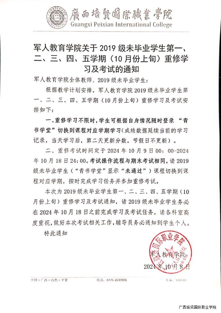 军人教育学院关于2019级未毕业学生第一、二、三🟨🧚🏼、四、五学期(10月份上旬)重修学习及考试的通知