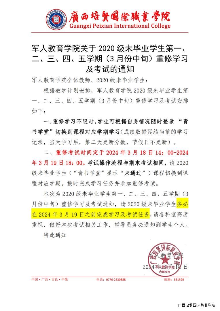 1. 军人教育学院关于 2020 级未毕业学生第一、 二、三👩‍⚖️、四、五学期(3 月份中旬)重修学习 及考试的通知
