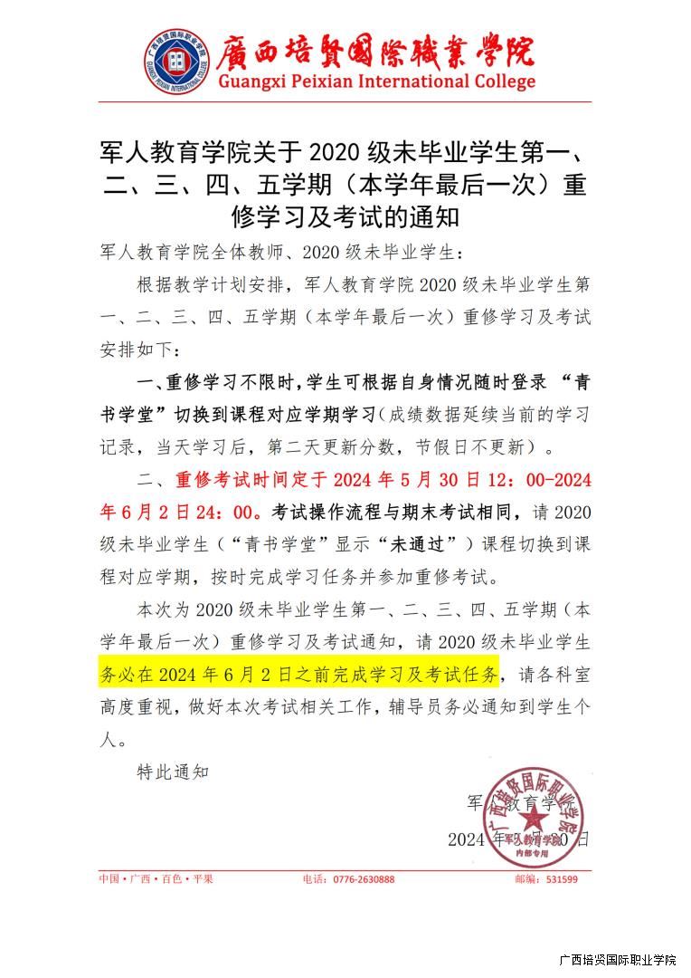 1. 军人教育学院关于2020级未毕业学生第一、 二、三、四🫱🏽、五学期(本学年最后一次)重 修学习及考试的通知
