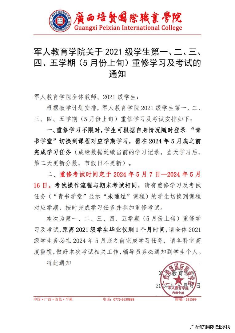 军人教育学院关于2021级学生第一、二、三🫸、 四、五学期(5月份上旬)重修学习及考试的通知