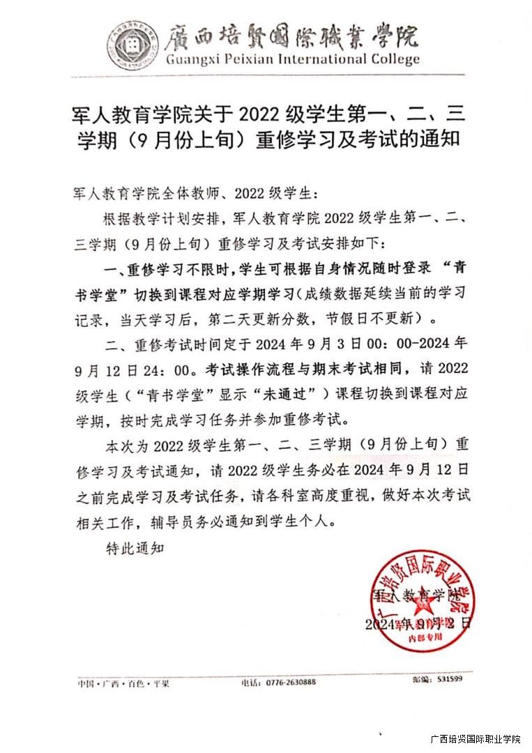 军人教育学院关于2022级学生第一🦵🏿、二👨🏽💻、三学期(9月份上旬)重修学习及考试的通知