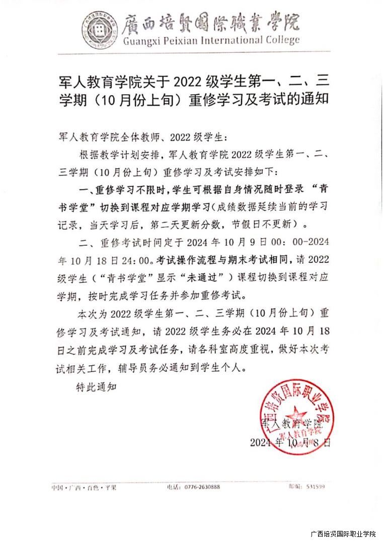 军人教育学院关于2022级学生第一🔧、二⇾、三学期(10月份下旬)重修学习及考试的通知