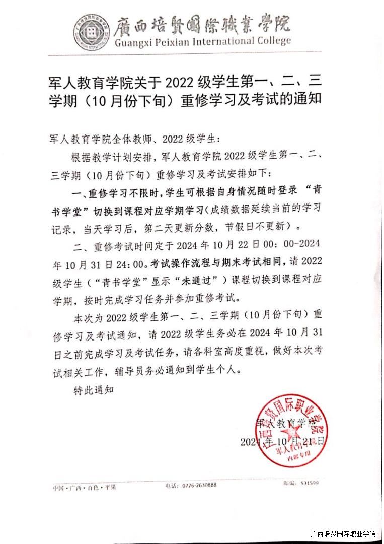 1. 军人教育学院关于2022级学生第一、二、三学期(10月份下旬)重修学习及考试的通知