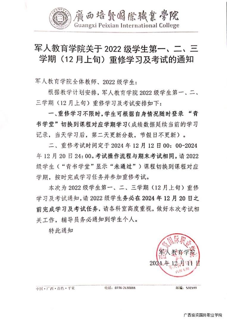 1. 军人教育学院关于2022级学生第一、二👨🏻‍🏫、三学期(12月上旬)重修学习及考试的通知