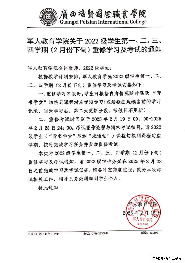 军人教育学院关于2022级学生第一🧑🦽➡️、二🧑🏻💻、三、 四学期(2月份下旬)重修学习及考试的通知
