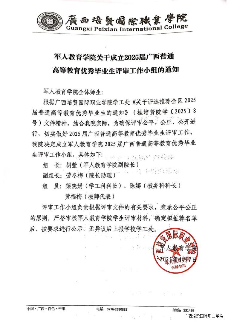 军人教育学院关于成立2025届广西普通高等教育优秀毕业生评审工作小组的通知
