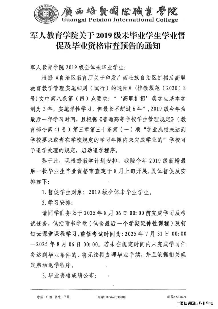 军人教育学院关于2019级未毕业生学业督促及毕业资格审查预告的通知