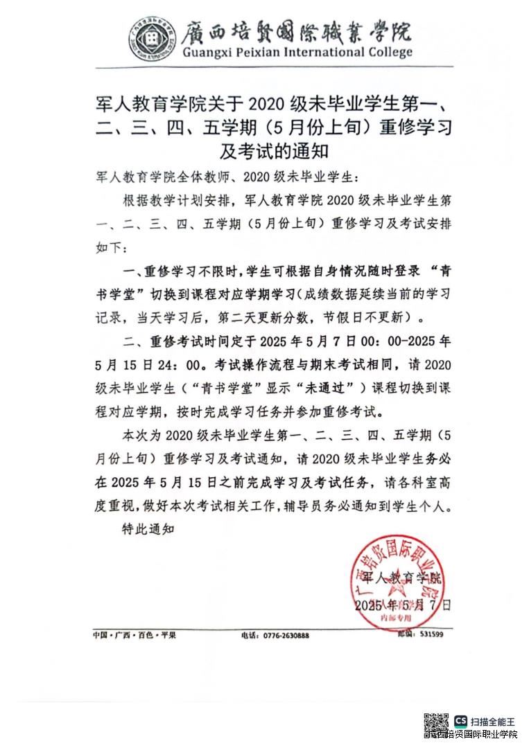 1. 军人教育学院关于2020级未毕业学生第一、二👩‍👩‍👧‍👦、三👨🏼‍🦲、四、五学期(5月份上旬)重修学习及考试的通知
