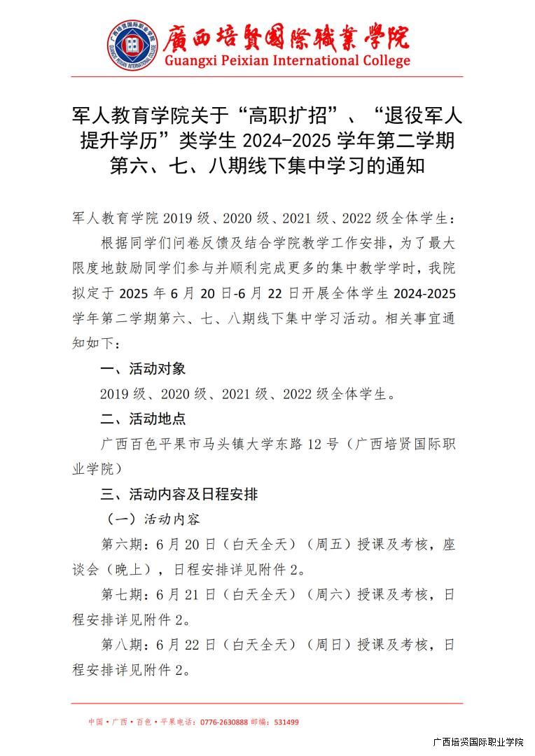 军人教育学院关于“高职扩招”🧟♀️、“退役军人提升学历”类学生2024-2025学年第二学期第六、七🚂、八期线下集中学习的通知