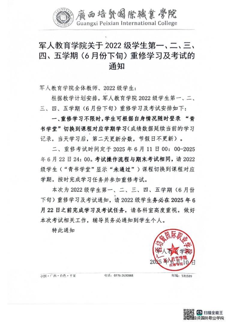 1. 军人教育学院关于2022级学生第一💈、二、三、四🤶🏽、五学期(6月份下旬)重修学习及考试的通知