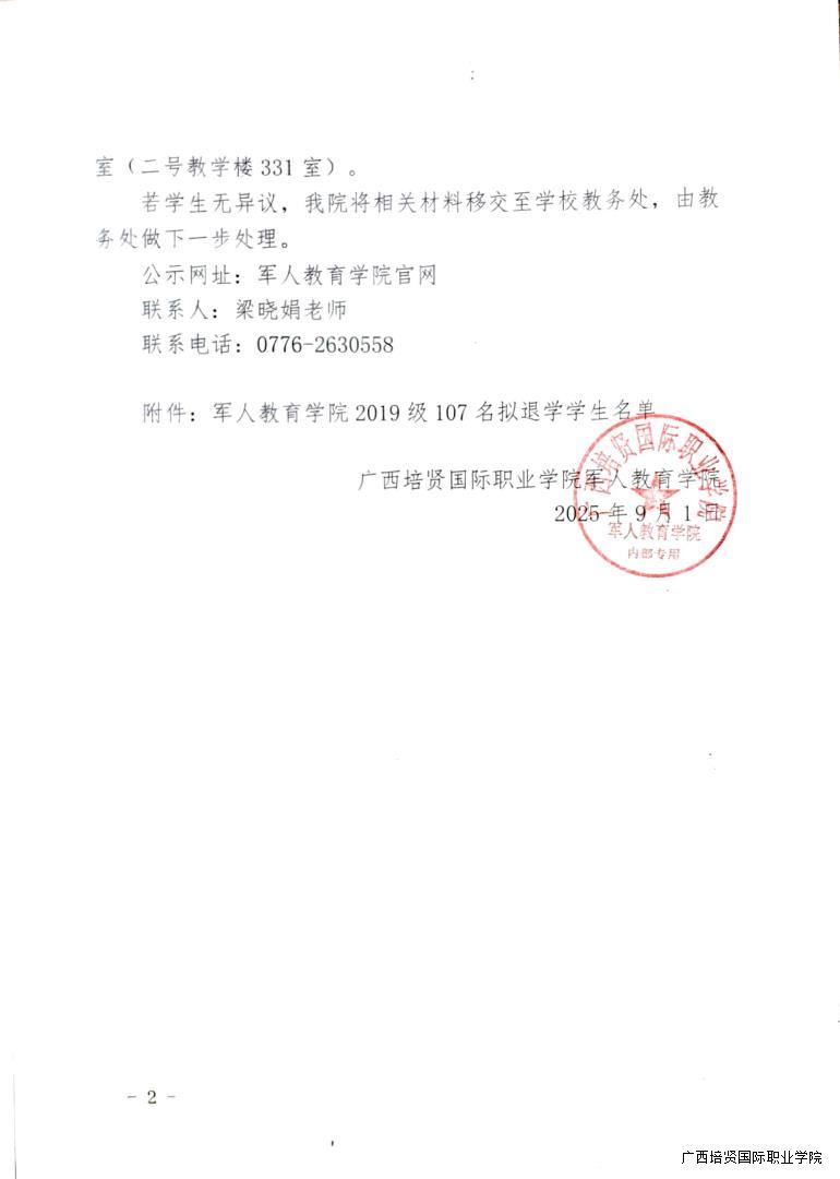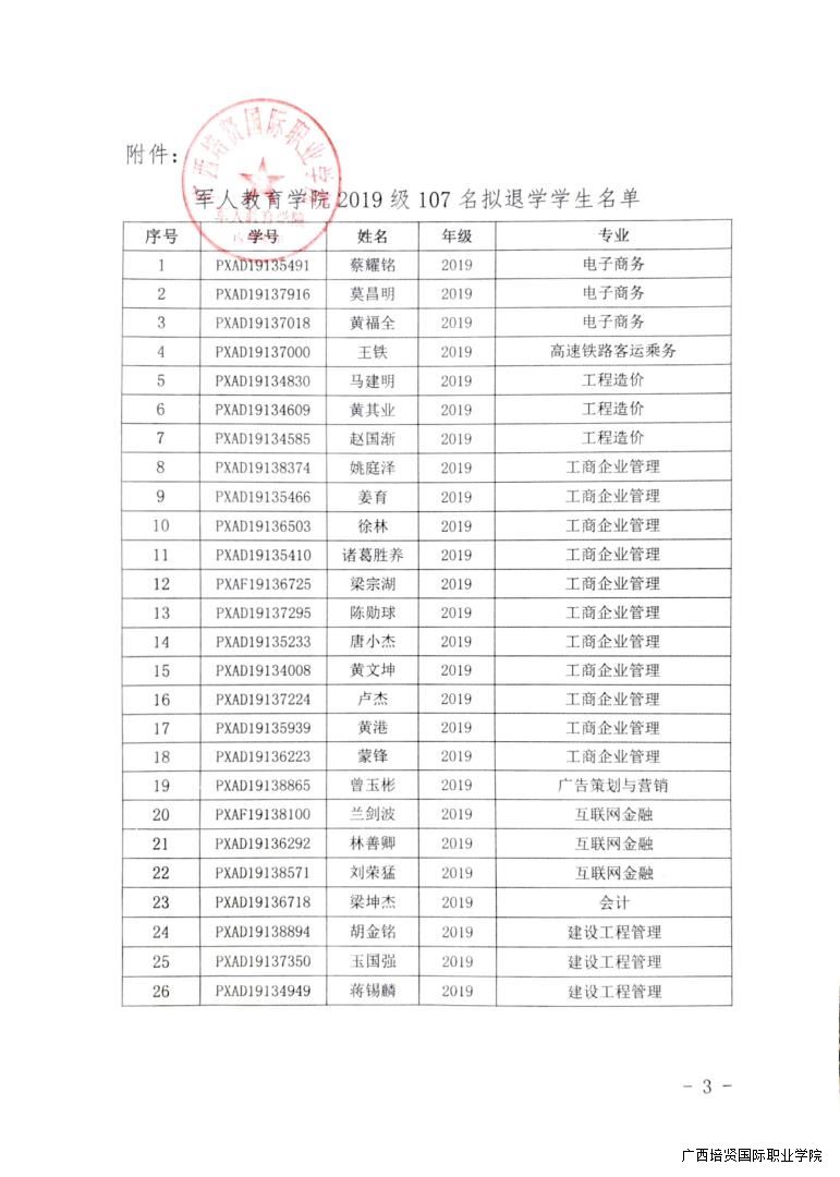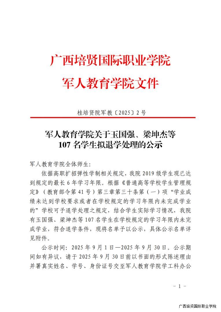 军人教育学院关于玉国强👨🏿🔧、梁坤杰等107名学生拟退学处理的公示