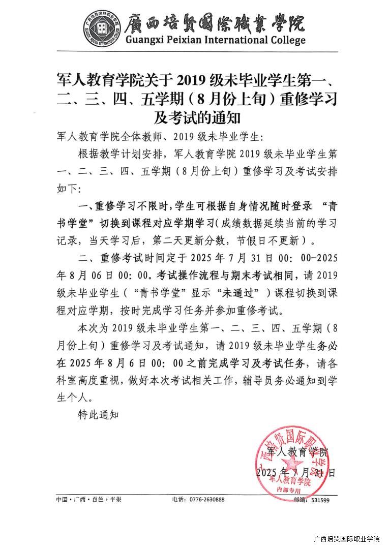 军人教育学院关于2019级未毕业学生第一、二、三、四、五学期(8月份上旬)重修学习及考试的通知